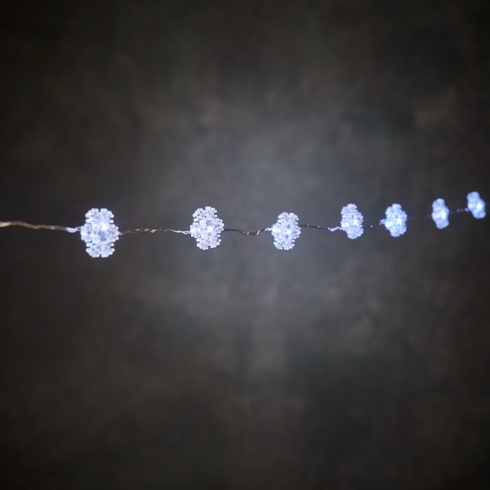 Lyskæde med snefnug. Sølvfarvet lyskæde med 20 snefnug med LED-lys. Lyskæden er 2 m lang. Lyskæden er med batteriboks.
