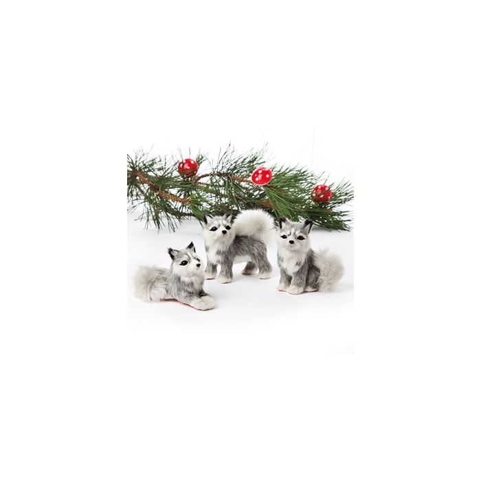 Sled dog. The sled dog measures 9 cm in height. Available in three variants: sitting, lying down or standing. Made of faux fur.