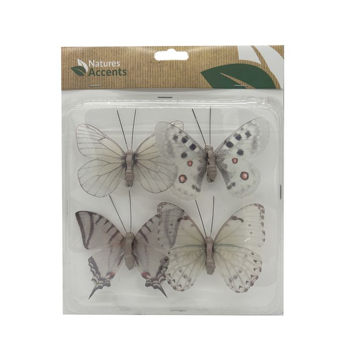Lyse, dekorative sommerfugle i naturtro udgave. Sommerfuglene er med klips under, så de nemt kan sættes fast på grene, pakker, kranse mv.