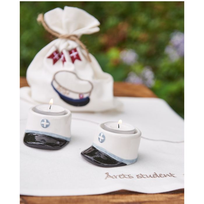 Hyggelig studenterpose med broderede dannebrogsflag og studenterhue på fra Speedtsberg. Fås med enten rød eller blå studenterhue.
