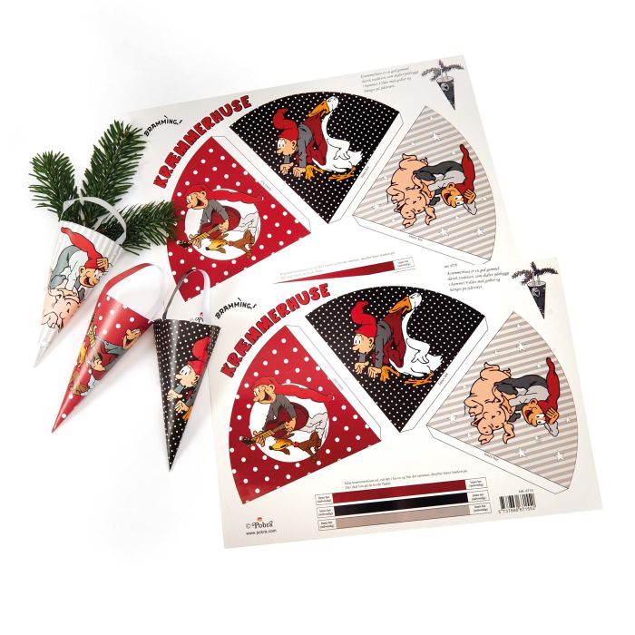 Paper cone with the well-known and happy Bramming elves on it. There are 2 sheets with cones to crop per bag. The sheet measures 28 cm x 40 cm.