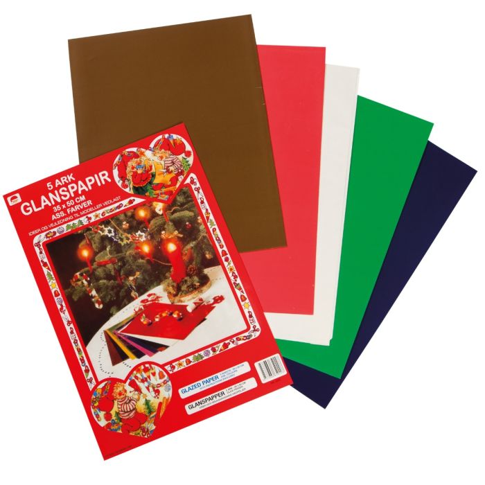 Pakke med farvet glanspapir indeholder 1 hvidt, 1 rødt, 1 blåt, 1 grønt og 1 guldfarvet. Der er enkelte skabeloner med vejledning til.