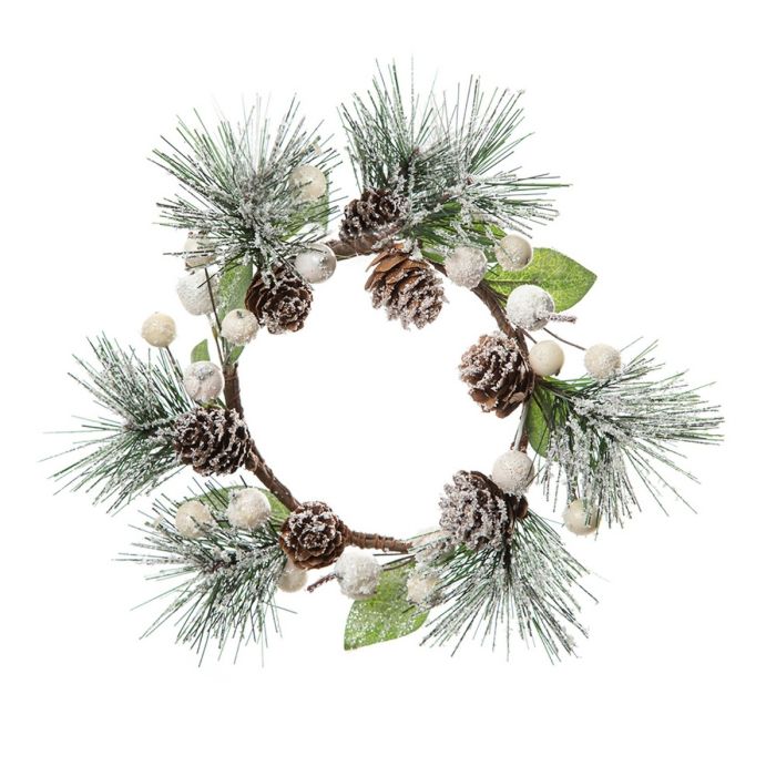 Lyskrans til bloklys med brune kogler, hvide bær, blade og fyrtotter, alle med et drys "sne". Det lette sne- og frosted look tilføjer en vinterlig charme, der passer godt til både jule- og vinterdekorationer. Pynter og bringer lidt ekstra julestemning med sig, hvad end du har bloklyset stående i en stage, på et lysfad eller blot på bordet.