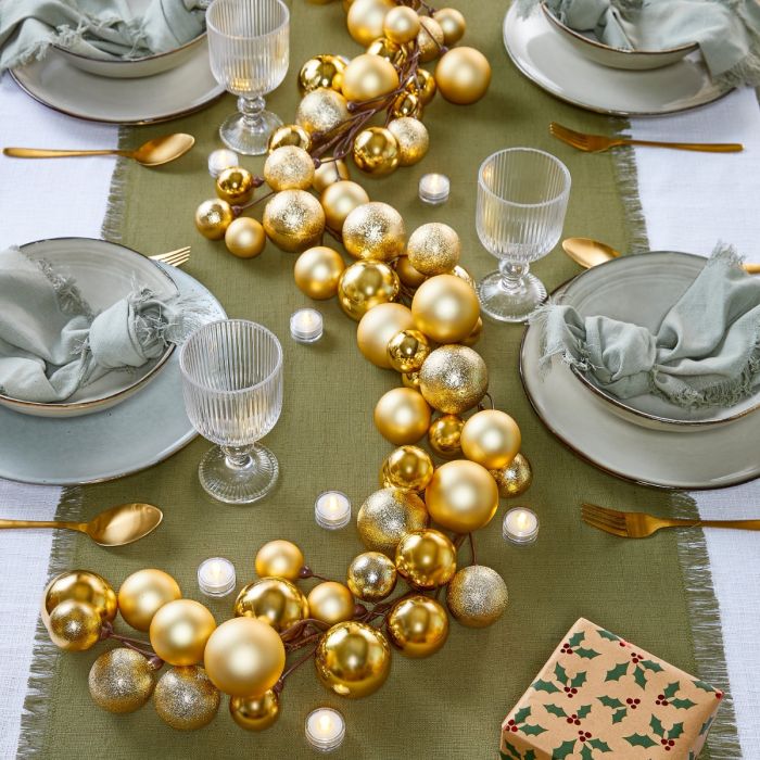 Flot 180 cm lang guirlande pyntet med 68 guldfarvede julekugler i forskellige størrelser: 29 x 6 cm i dia, 17 x 7 cm i dia og 22 x 8 cm i dia. Kuglerne er lavet i genanvendt plast og kommer i tre varianter: blanke, matte og med glimmer, hvilket giver et flot spil. Guirlanden er med naturfarvet snor, der diskret falder i ét med gran, så den er nem at integrere i et juletræ eller sammen med en granguirlande. Den kan også bruges som pynt på bordet, langs en hylde eller hængende i vinduet for at skabe ekstra julestemning. Julekugleguirlanden fås også med røde eller mixede farver af julekugler.