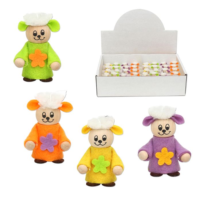 Wool Easter sheep with Easter colored suit and a flower on the belly. The ears have the same color as the suit. Available in 4 different colors: green, orange, yellow and purple. It measures 5 cm in height.