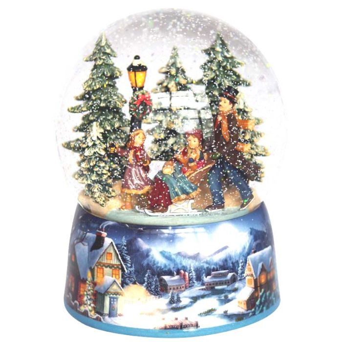 Sled ride snow globe. Inside the snow globe, there is a family on a walk in the forest. The snow globe's base has a village motif. When the battery-powered (batteries are not included) jukebox is switched on, the snow is automatically blown around, the lamp lights up and the melody "Skøjtevalsen" plays. The snow globe has a diameter of 15 cm and a height of 19 cm.
