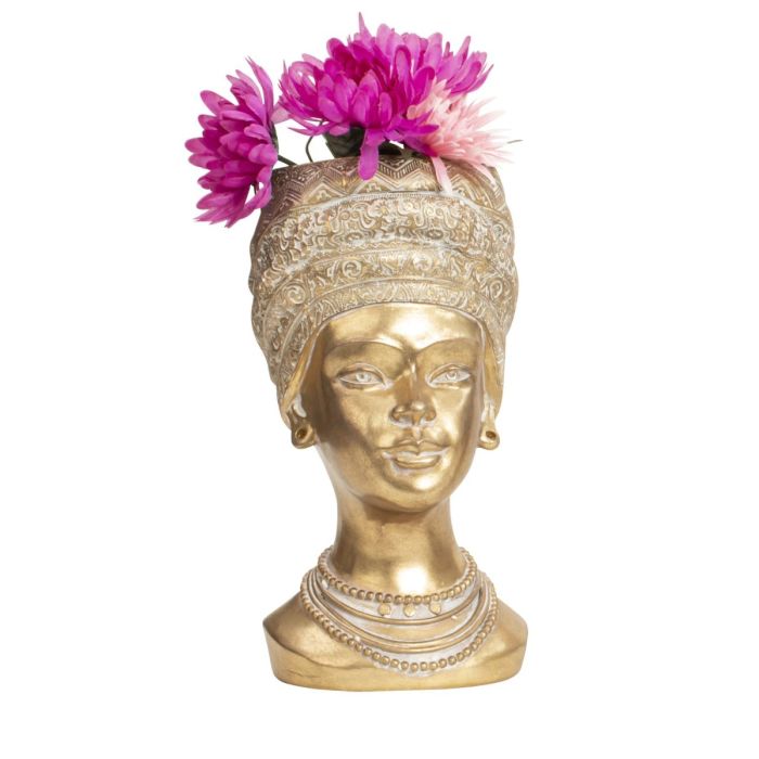Guldfarvet buste til plante udformet som et damehoved i afrikansk stil. Meget flot og dekorativ fx med grønne planter eller kunstige stilke.