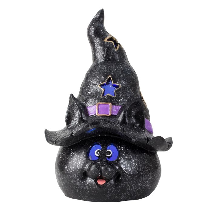 Witch cat. Large black cat head with black witch hat, purple ribbon and stars. The stars have LED lights. The witch cat is battery powered (batteries not included). The witch cat is made of polyresin (it cannot withstand severe frost). The witch cat measures 30 cm in width and 45 cm in height.