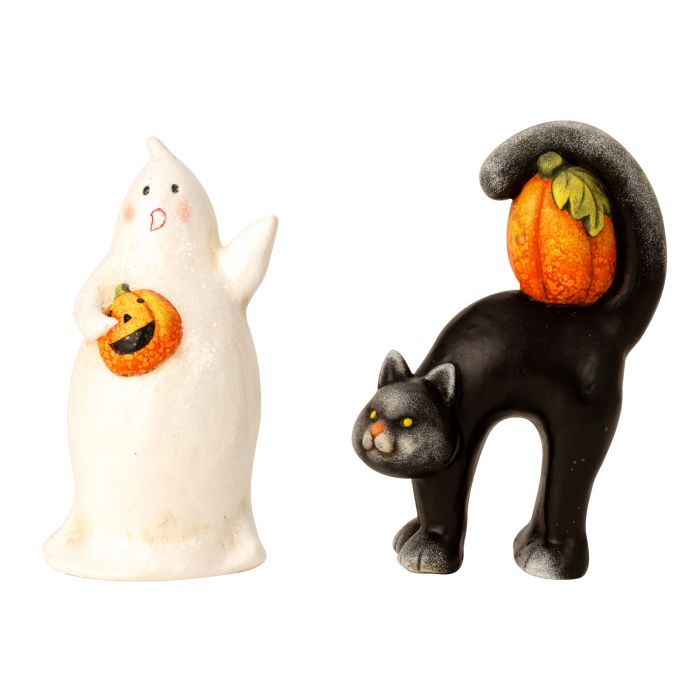 Ghost or cat carrying a small pumpkin. The figurines measure 17.5 cm in height. Made of polyresin.