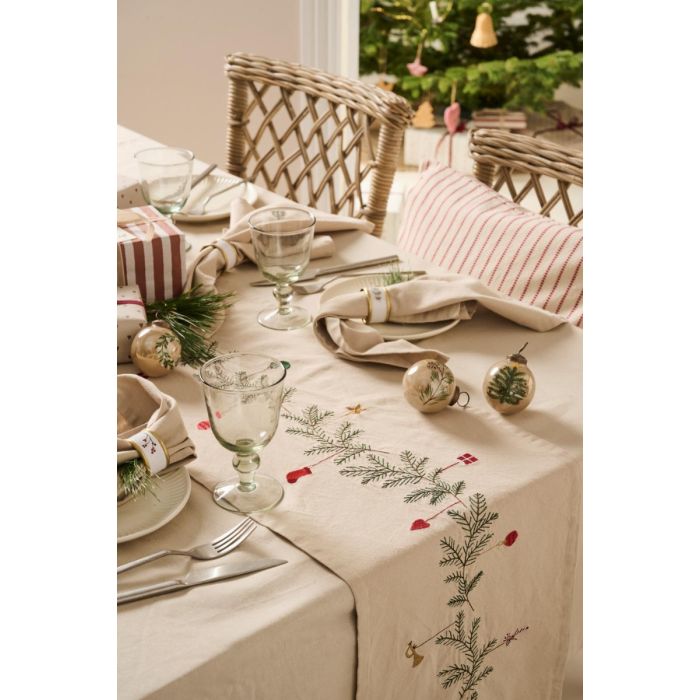 Giv dit julebord et klassisk og stemningsfuldt udtryk med denne smukke bordløber fra Ib Laursens Tradition-serie. Den hørfarvede løber er dekoreret med en elegant broderet granranke og små julemotiver som stjerne, gave, trompet og vante, der tilsammen skaber en hyggelig og nostalgisk julestemning. Bordløberen passer perfekt til både hverdag og fest i december og bliver et smukt udgangspunkt for din borddækning til julemiddage, adventshygge og familietid.