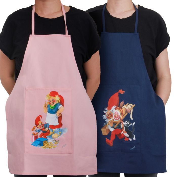 Practical apron for baking Christmas cookies and creating Christmas goodies. The apron is available in 2 variants: pink or blue. Both aprons have a Santa elf motif designed by Vilhelm Hansen. The apron measures 72 cm in height and 48 cm in width. Made of fabric.