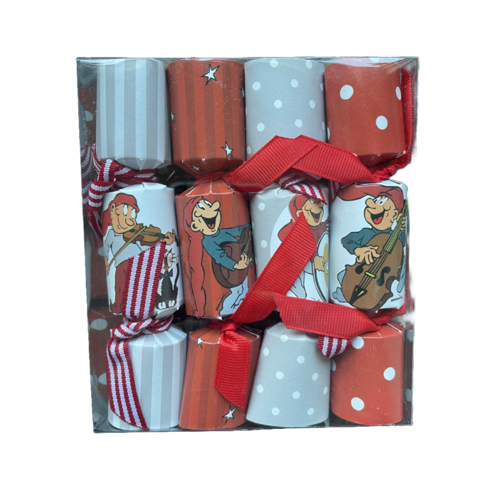 Knallerter til pynt på juletræet eller julebordet med instrument spillende Brammingnisser. Der er mini-ting i knallerterne.