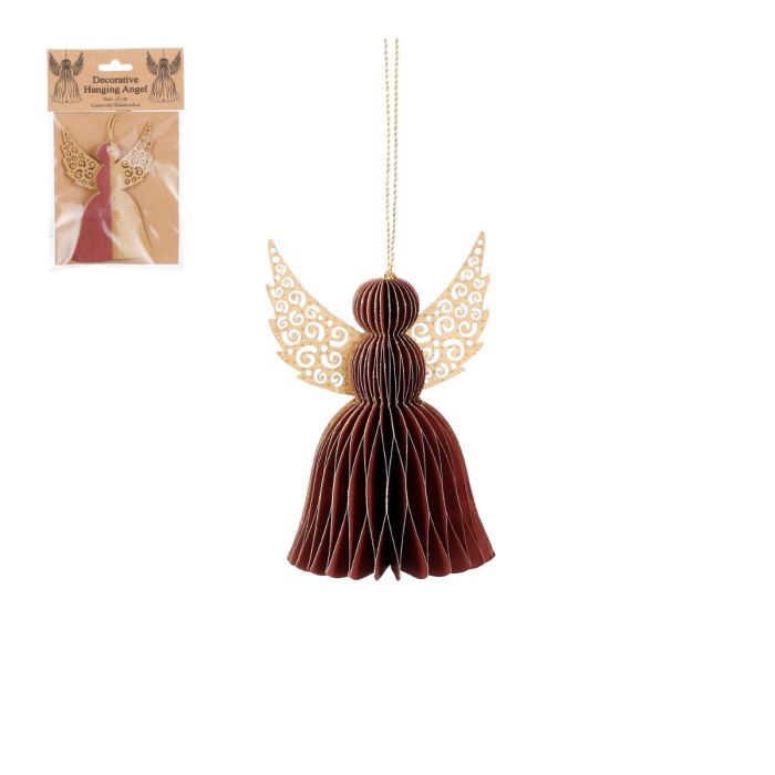A decorative, handmade dark red angel shaped ornament with wide dress and large wings made of paper. Hang it, for example, on branches, Christmas trees and windows. Available in several shapes and colours.