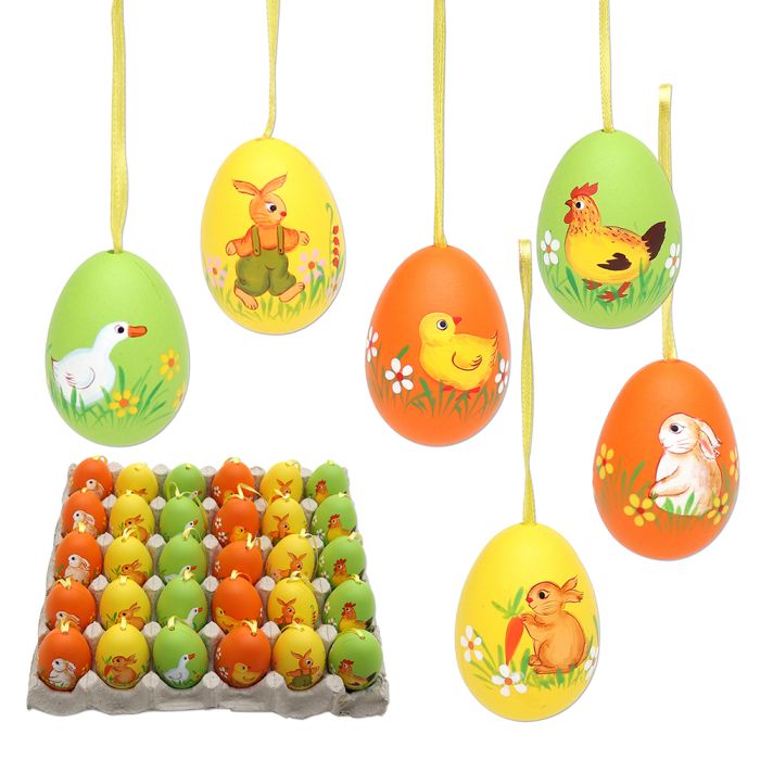 Plastic hand painted eggs with a small silk hanging cord. The Easter motifs vary, but it is possible to choose the color of the egg. The hand painted eggs measure 6 cm in height and have a diameter of 4 cm at their widest point. Mde of plastic.