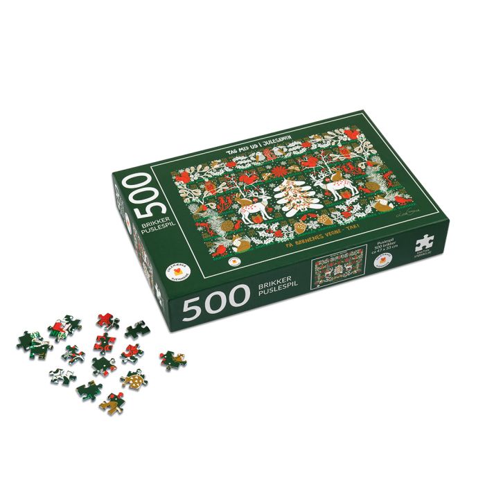 Puslespil med årets Julemærke. Indeholder 500 brikker. Når puslespillet er samlet, er det ca. 47 x 33 cm