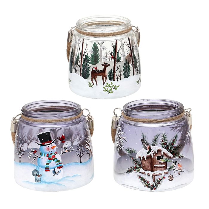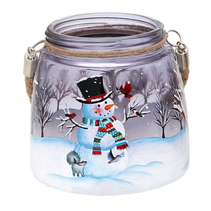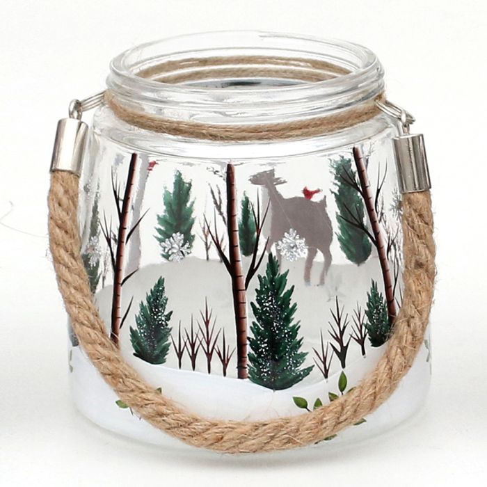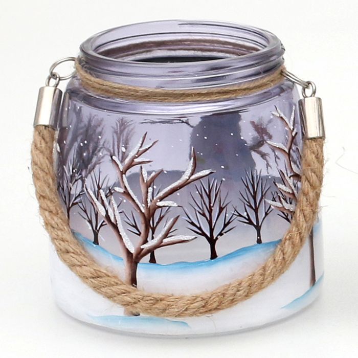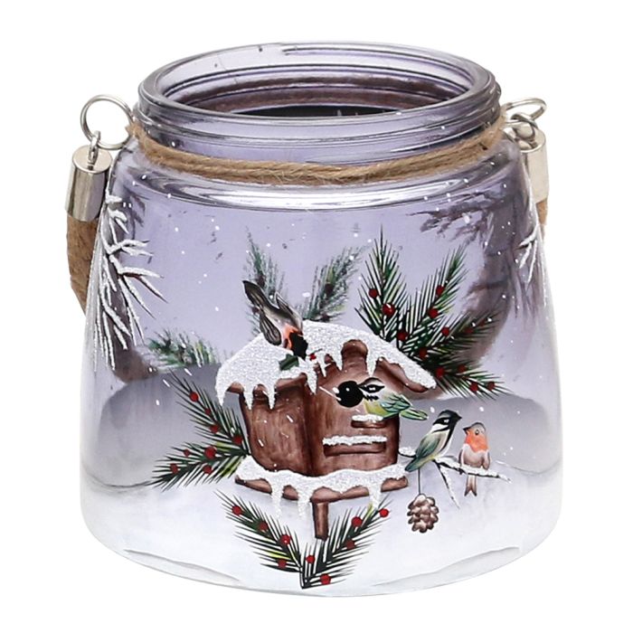 Winter lantern with handle and fine motifs. Available in 3 variants with either a snowman, roe deer or bird house. Place a small tealight candle in and create a cozy atmosphere. It measures 12 cm in height and has a diameter of 12 cm. Made of glass.