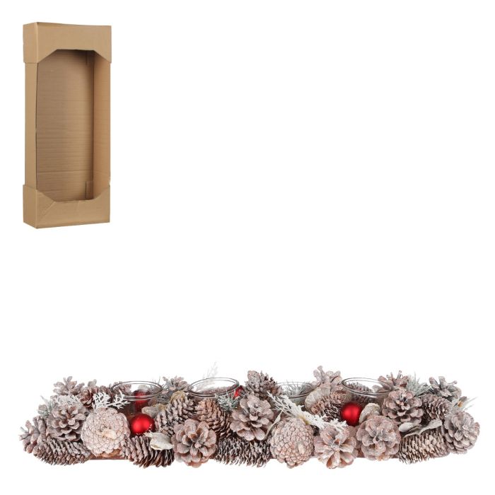Adventsstage med 4 glasstager til fyrfadslys. Adventsstagen er med snehvide kogler, røde julekugler og anden dekorationspynt. Super fin hele december uden dryssende grannåle.