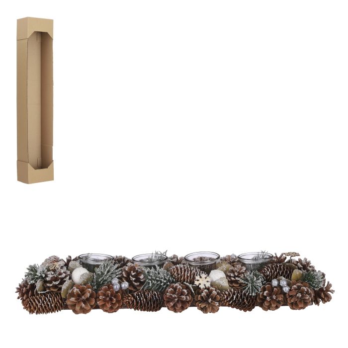Adventsstage med sne og masser af grankogler - med plads til 4 fyrfadslys i glasstagerne.