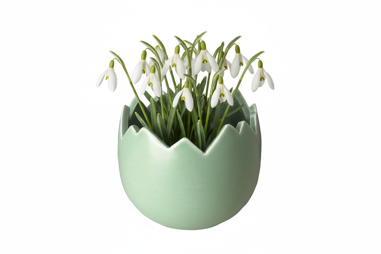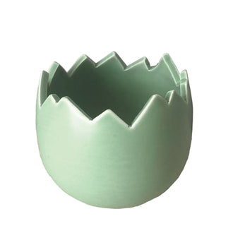 Bring foråret helt ind på bordet med denne fine æggeskal i glaseret keramik fra Pobra. Den bløde grønne nuance og den dekorative, ujævne kant giver skallen et levende og naturligt udtryk som et æg, der netop er klækket og klar til at rumme forårets små spirer.