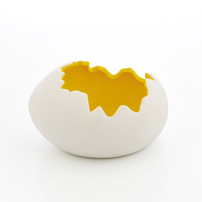 Denne æggeskal i porcelæn er en stilren og dekorativ påskedetalje, der kombinerer hvid yderside med en varm, gul inderside, hvilket giver et friskt og forårsagtigt udtryk. Formen er inspireret af en naturligt knækket æggeskal og skaber et charmerende og samtidig elegant look, som passer godt ind i både moderne og klassiske påskearrangementer. Med en længde på 15 centimeter og en højde på 9 centimeter har skålen en praktisk størrelse, der gør den velegnet til små påskeæg, fyldte chokolader eller naturlige elementer som mos, fjer og blomster.
