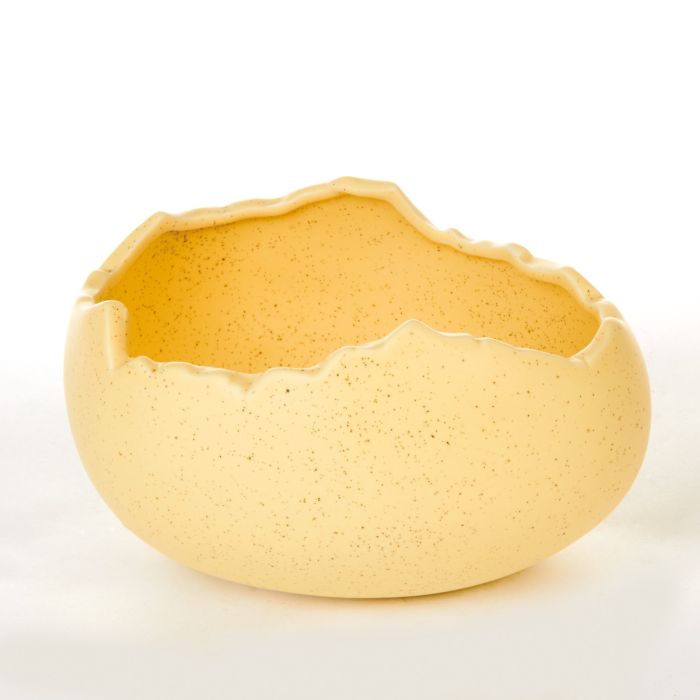 Denne fine, åbne æggeskal i lysegult keramik er en dekorativ detalje, der passer smukt ind i forårets og påskens pynt. Overfladen har en let struktur, som giver æggeskallen dybde og et roligt, naturligt udtryk. Den bløde lysegule farve tilfører et varmt og venligt præg, der fungerer godt sammen med både grønne planter og andre påskedekorationer.