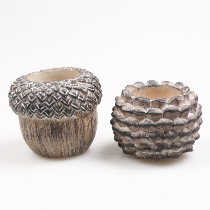 Agern eller grankogle fyrfadsstage. Hyggelige efterårsfyrfadsstager i brun nuance og med tydelig agern- og grankoglestruktur.