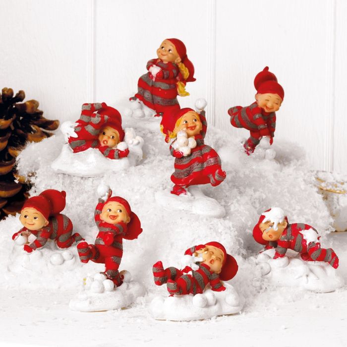 Sneboldkamp, latter og juleglæde! Babynisserne i sneen er i fuld gang med at lege, kaste snebolde og tumle i den friske vintersne. Der er smil på læben og glimt i øjet, mens de små nisser nyder vinterens glæder i deres klassiske røde og grå nissetøj. Babynisse i sneen findes i otte forskellige varianter, hver med sin egen glade positur og udtryk. Nogle ruller snebolde, andre kaster eller leger gemmeleg. Figurerne er udført i polyresin med fine detaljer og julede farver, der indfanger den livlige stemning af vinter, leg og jul. Babynisserne er designet af Susanna Hartmann for danske Pobra, kendt for deres klassiske og nostalgiske juleunivers med de elskede babynisser i rødt og gråt nissetøj. En livlig og stemningsfuld serie julefigurer, der bringer vinterleg, nissehygge og masser af julestemning ind i hjemmet. Klar til at pynte i et nisselandskab med sne eller på hylder, borde og vindueskarme.