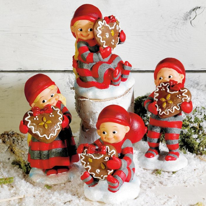 De søde babynisser har fundet julens honninghjerter frem og står klar til at sprede varme og kærlighed i den søde juletid. Hvert hjerte er pyntet med hvid “glasur” og en stor rød sløjfe, og nisserne holder dem med både glæde og stolthed. Babynisse med honninghjerte fås i fire varianter: to nissepiger: én stående med hjertet i hænderne og én siddende samt to nissedrenge i de samme positurer. Figurerne er udført i polyresin med fine detaljer og julede farver, der fanger den varme og klassiske julestemning. Babynisserne er designet af Susanna Hartmann for danske Pobra, kendt for deres elskede og nostalgiske juleunivers med babynisser i rødt og gråt nissetøj. En romantisk og stemningsfuld serie julefigurer, der bringer både kærlighed, tradition og nissehygge ind i hjemmet. Kan fx pynte i nisselandskabet eller på hylder og borde.