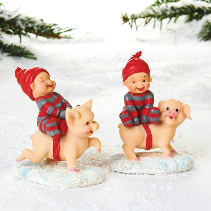 De glade babynisser har fundet sig nogle usædvanlige ridedyr nemlig julens mest charmerende grise! Med store smil og juleglæde rider nisserne af sted gennem sneen, mens både nisser og grise ser ud til at nyde turen i fulde drag. Babynisse på gris findes i to varianter, begge med en babynissedreng ridende på ryggen af en glad gris. Figurerne er udført i polyresin med fine detaljer og gode farver, der fanger følelsen af leg, eventyr og klassisk julestemning. Babynisserne er designet af Susanna Hartmann for danske Pobra, kendt for deres nostalgiske og elskede nisseunivers med de små babynisser i rødt og gråt nissetøj. En livlig julefigur, der bringer smil og hyggelig nisseenergi ind i hjemmet. Passer godt til nisselandskabet eller som et festligt indslag i julens dekorationer.