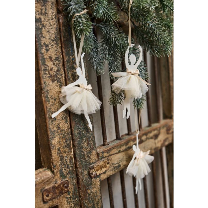 Elegant ballerina i metal fra Speedtsberg med fint tylskørt og dekorativ sløjfe. Figuren er med snor til ophængning og fås i tre forskellige balletstillinger, som hver især udstråler lethed, ynde og bevægelse. Ballerinaen er en smuk dekoration til hjemmet og kan hænges i vinduet, på en gren eller bruges som pynt på juletræet. Designet matcher de populære ballerinaer i papir fra Speedtsberg.