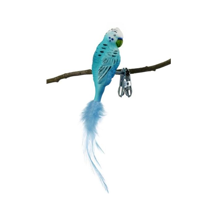 Blå undulat med klips. Detaljeret blå undulat med fjerhale. Undulaten er mundblæst og håndmalet på Glasbläserei Thüringer Weihnacht.