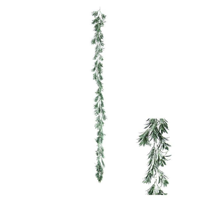 Mørkegrøn bladguirlande med "sne" på bladene. En flot og anderledes guirlande i forhold til granguirlanderne. Kan fx bruges som pynt i vinduet eller liggende i vindueskarmen.