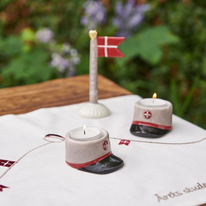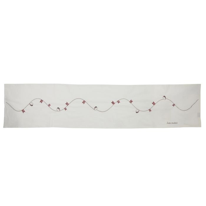 Festlig, hvid bordløber til studentergildet med små broderede dannebrogsflag og røde studenterhuer på fra Speedtsberg.