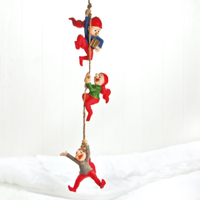 Der er altid fart og fest, når Brammingnisserne fra Pobra dukker op. Her ses tre nisser, der kravler lystigt op ad rebet måske på vej mod loftet for at finde risengrøden eller gemme sig i julepynten. De glade ansigter og livlige bevægelser giver straks fornemmelsen af, at de er midt i en sjov nisseleg, som kun Brammingnisserne kan finde på. Denne klassiske juledekoration er udført i polyresin og har en reb-længde på 65 cm, mens nisserne hver især måler cirka 10 cm. Den kan hænges i vinduet eller på en dørkarm, hvor den vil tiltrække både smil og nysgerrige blikke. Brammingnissen har været en fast del af dansk julepynt siden midten af 1900-tallet og forbindes med hygge, tradition og et strejf af drillende glæde. Med deres røde huer og muntre udtryk spreder disse hængende nisser præcis den varme og livsglæde, der gør julen til noget særligt.