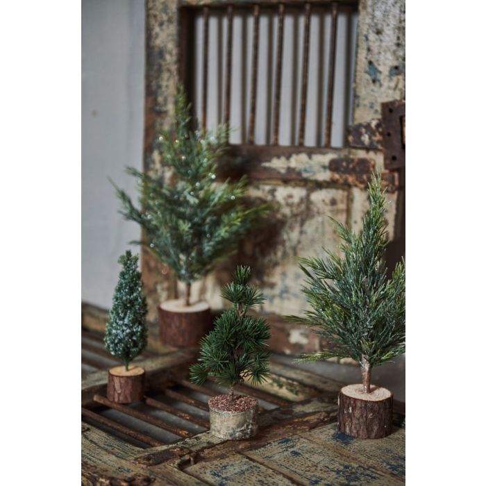 Lille, dekorativt cedertræ fra Speedtsberg med en træskive som base. Træet kan være den grønne detalje ved siden af keramikhuset til jul eller skabe liv blandt efterårets kogler og nødder på en lysbakke. Det tilføjer et naturligt og hyggeligt udtryk til dine dekorationer og fås i flere variationer.