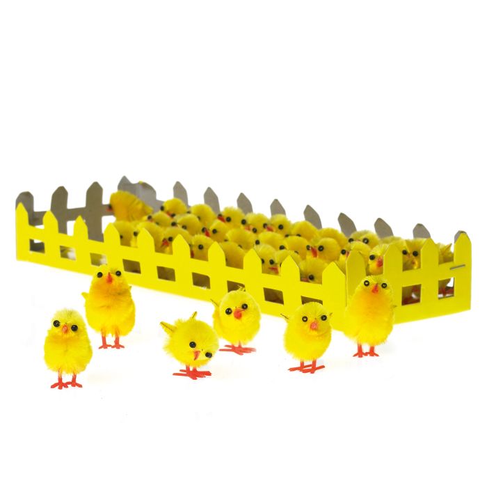 Chenillekyllingerne leveres i en plastæske, hvor de er samlet bag et lille gult hegn i karton, som understøtter det dekorative helhedsindtryk. Den lille størrelse gør dem velegnede til detaljerede opstillinger, hvor de kan bruges i gentagelser på påskebordet, i dekorationer, mellem planter eller i sammenplantninger. De egner sig også godt til kreative projekter, hvor mange ens elementer skaber rytme og sammenhæng.