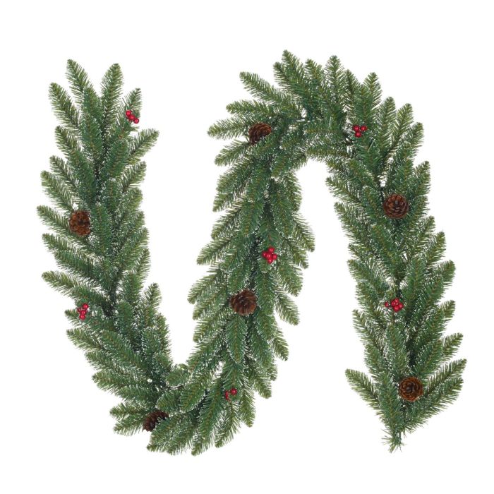 Creston kunstig granguirlande med let sne på nålene. Guirlanden er pyntet med røde bær og kogler med sne på. En flot, tæt guirlande, der kan hænge både ude og inde.