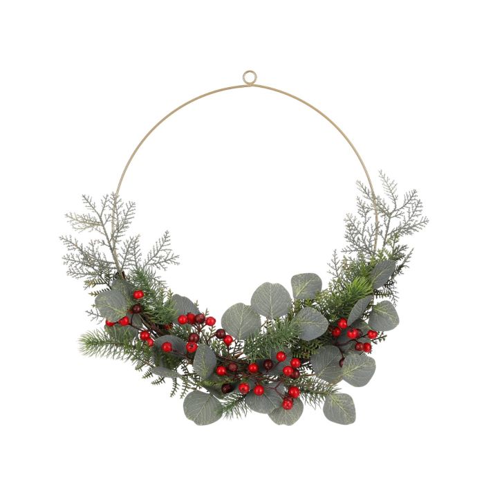 Guldfarvet dekorationsring med kunstig grandekoration og klaser med røde bær. Kransen har en diameter på 50 cm. Smuk og dekorativ til ophængning på fx døre eller i vinduer.