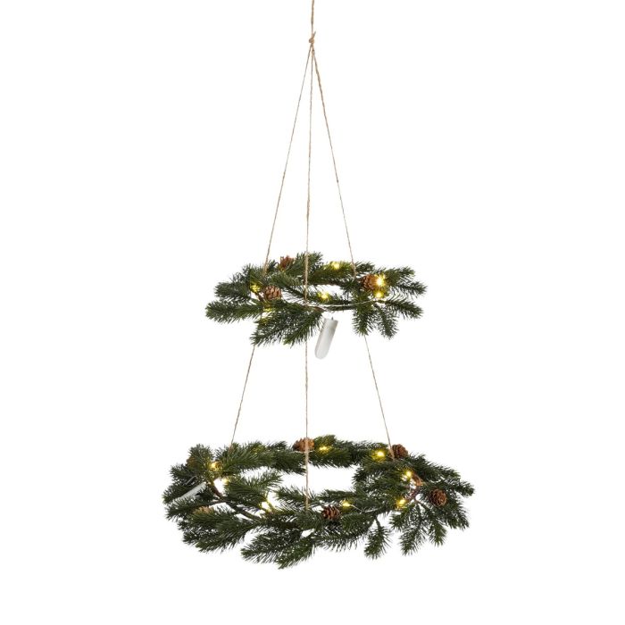Grankranse med to ringe i ophæng pyntet med 17 led-lys. Kransene kan dekoreres med alt fra engle til julekugler. Meget dekorative med eller uden pynt.