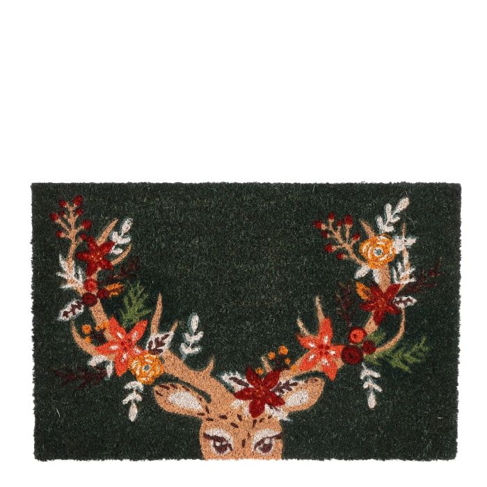 Dørmåtte med stort julepyntet gevir på mørkegrøn baggrund. Måtten er i god kvalitet fra House of Seasons. En hyggelig måde at byde højtiden velkommen ind.