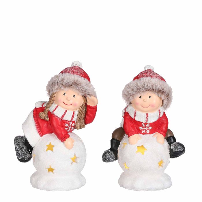 Sjove figurer, der sidder på snebolde. Både pige og dreng har rødt vintertøj på, og en matchende hue med blød kant. Der er lys i snebolden. Figuren findes i 2 varianter: dreng eller pige.