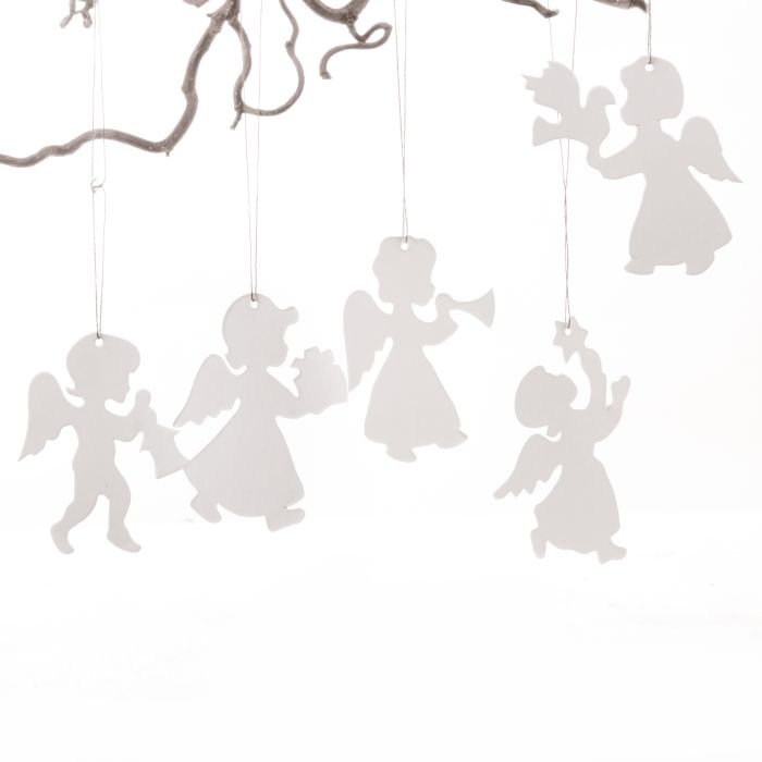 Englene hænger i tynd, hvid tråd, som næsten forsvinder, når de er ophængt. Det giver indtryk af, at figurerne svæver let i luften, hvad enten de hænger på juletræet, på grene i en vase eller samlet i et vindue. De forskellige englemotiver tilfører variation og liv, så ophængningen aldrig virker ensformig, men i stedet fremstår legende og harmonisk.