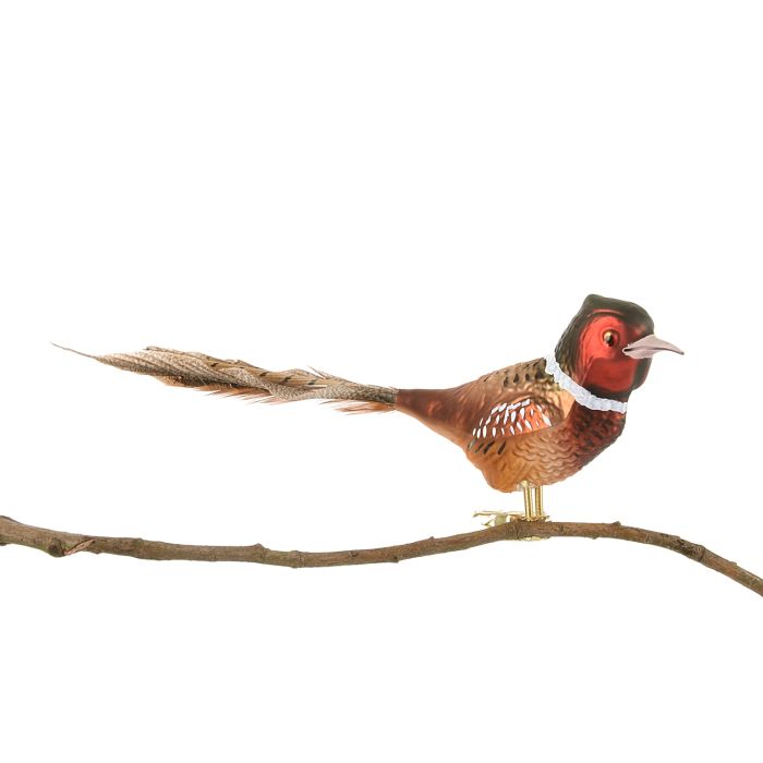 Fasanen har ægte halefjer, som tilfører et naturligt præg og en let svajende bevægelse, når den placeres på juletræet eller i en dekoration. Den måler 12 centimeter fra næb til starten af halefjeren og har en højde på otte centimeter. Fra næb til halefjerens spids når den en samlet længde på 25 centimeter, hvilket gør den både markant og elegant uden at virke tung.