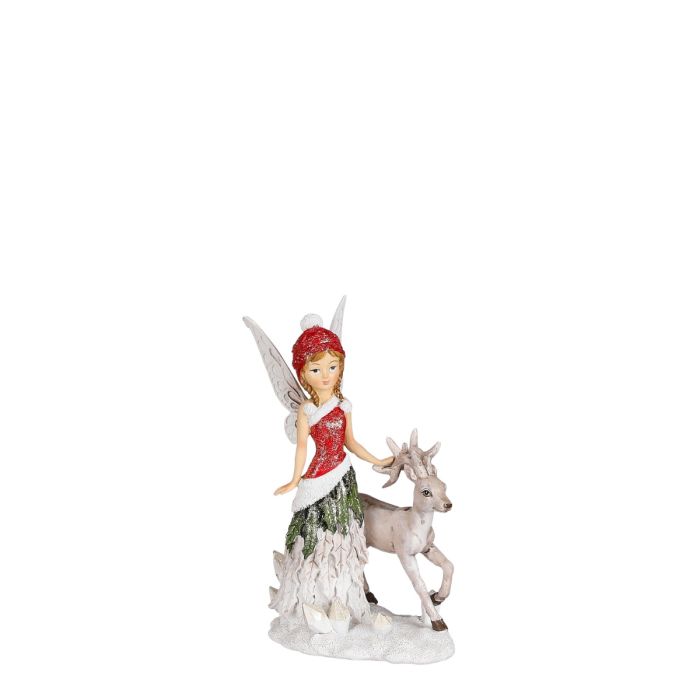 Fe med sommerfugleagtige vinger, julefarvet tøj og bladskørt. Hun går ved siden af et hvidt rådyr på den iskolde vinterjord, hvorpå der stikker snekrystaller op. Hyggelig jule- og vinterfigur fra den nye serie med feer.