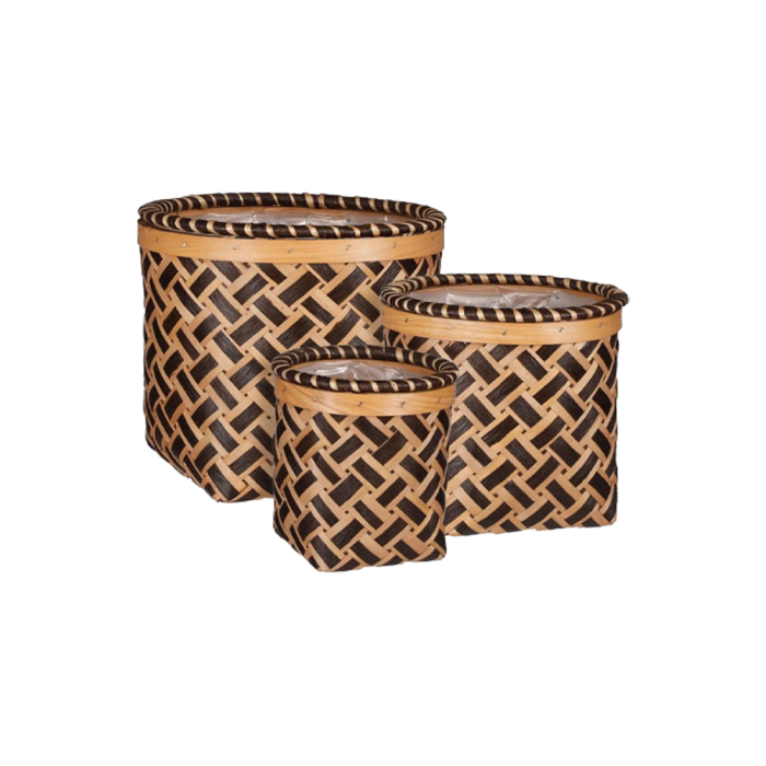 Kurvesæt med 3 kurve i forskellige størrelser, alle foret med plast på indersiden. Kurvene er fremstillet af bånd af spån i flet af mørke og lyse farver. Flotte med grønne planter i.