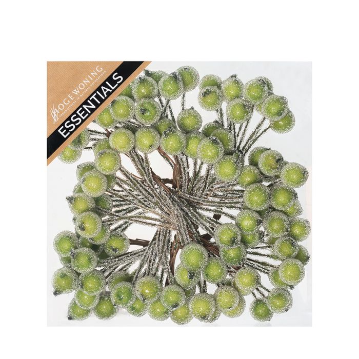 Frostede bær på wire grønne. De små, grønne bær sidder på en lille metalwire til at stikke ind i kransen, oasissen, leret, jorden mv. Der er 12 klynger med 10 bær på hver i en æske.
