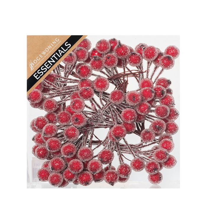 Frostede bær på wire røde. De små, røde bær med "frost" sidder på en lille metalwire til at stikke ind i kransen, oasissen, leret, jorden mv. Der er 12 klynger med 10 bær på hver i en æske.