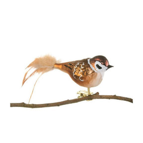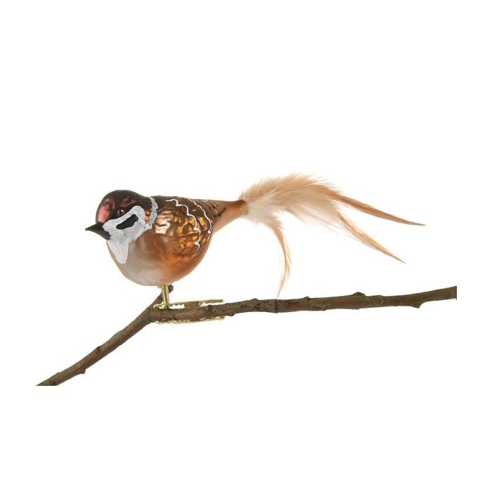 Den brune hale er lavet af ægte fjer, hvilket tilfører et let og elegant spil, når skovspurven sidder på en gren eller i en dekoration. Med en længde på 18 cm inklusive halefjer har den en behagelig størrelse, som gør den synlig uden at virke dominerende i juletræet.