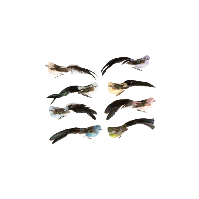 Dekorative fugle med farvet fjerbryst/hoved og lange, mørke halefjer. Fuglene er med klips så de nemt kan sættes på grene, kranse eller bruges som bordpynt. Fuglene fås i 8 forskellige farver.