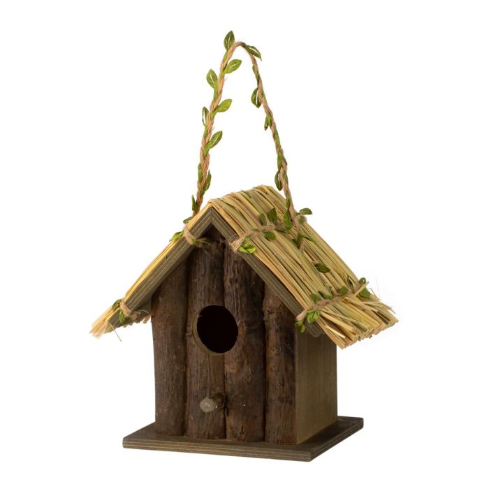 Hyggeligt fuglehus til havens små fuglevenner. Fuglehuset er i træ med lille pind foran og hul ind til huset. Taget er også i træ med strå på, og der er monteret en snor pyntet med kunstige blade til ophængning.